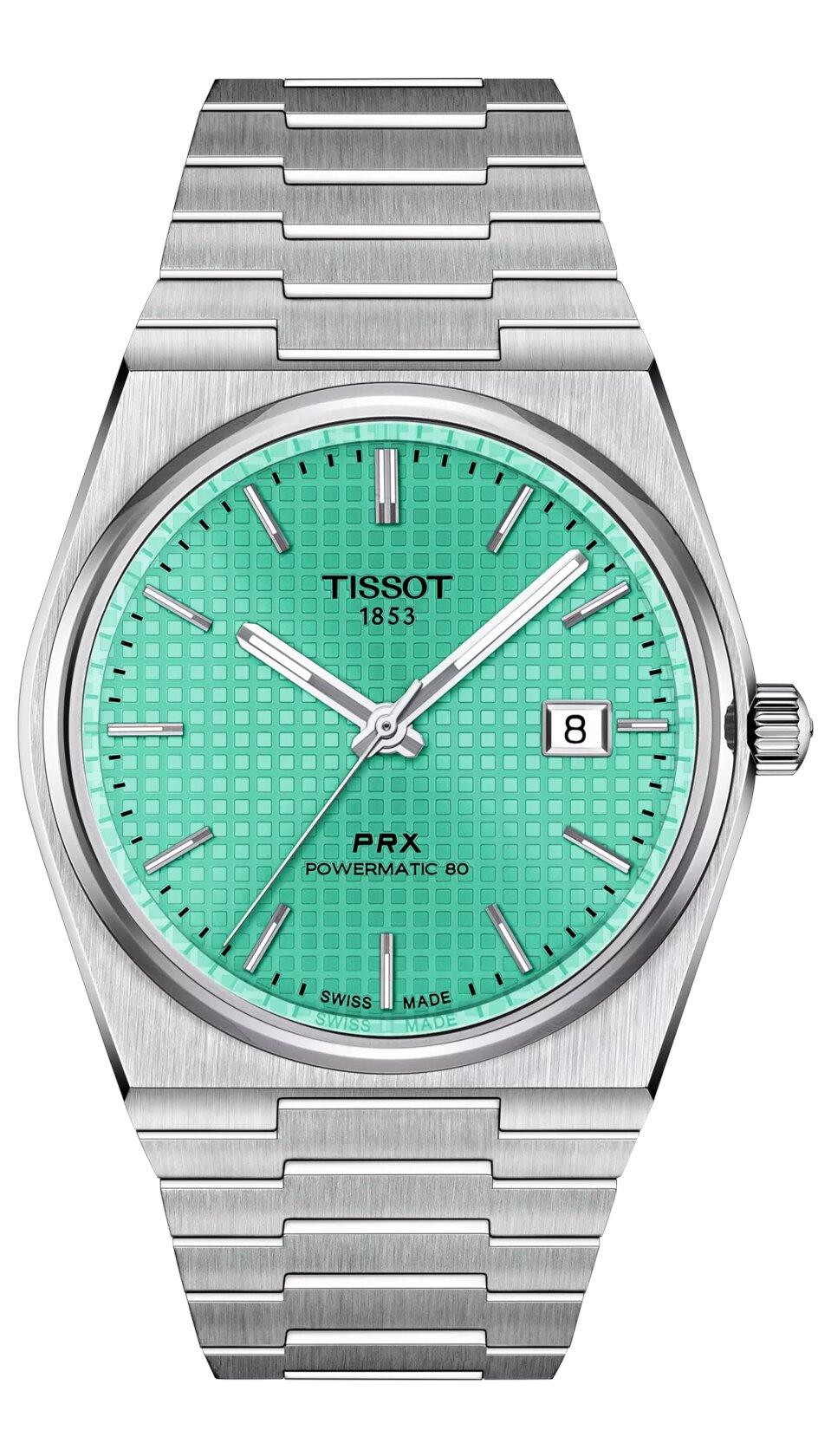 Ρολόι του οίκου Tissot, της σειράς PRX με πράσινο καντράν και ατσάλινο μπρασελέ. Κάσα από ανοξοόδωτο ατσάλι. Επίπεδο στεγανότητας στα 100 μέτρα και μέγεθος πλαισίου 40mm από ανοξείδωτο ατσάλι 316L. Διαθέτει παράθυρο με ένδειξη ημερομηνίας. Αντιχαρακτικό κρύσταλλο σαπφείρου με αντιανακλαστική επίστρωση. Ελβετικός μηχανισμός αυτόματος με αυτονομία εώς και 80 ώρες. Εμφανής μηχανισμός στην πίσω όψη του. Δείκτες με υλικό  Superluminova.