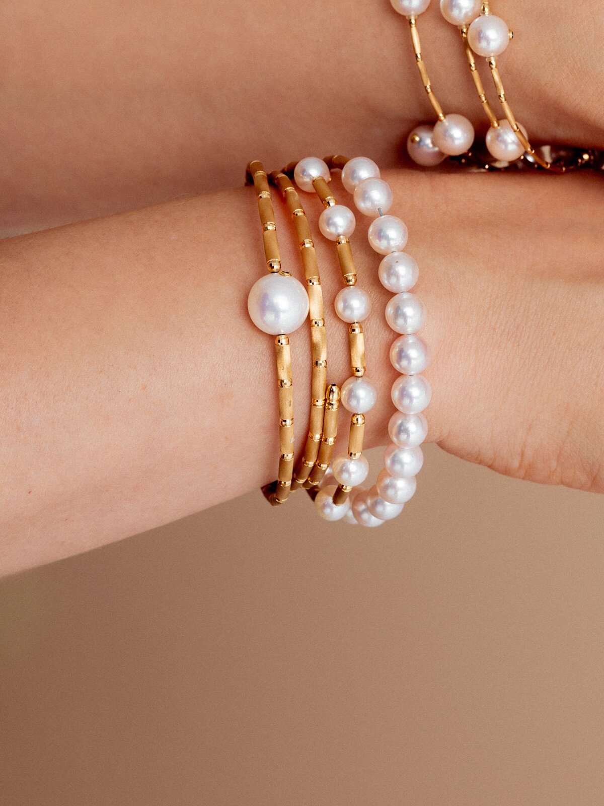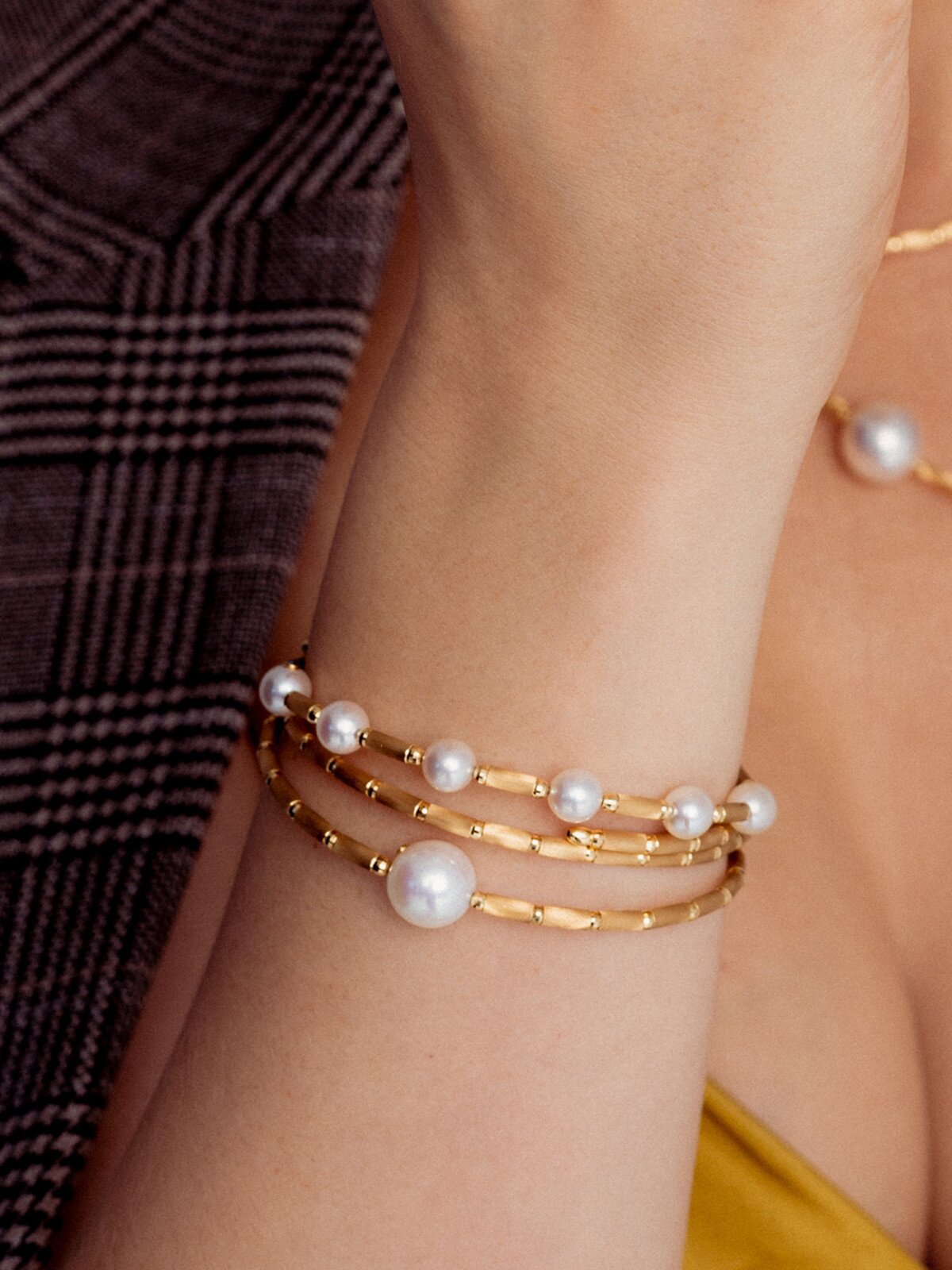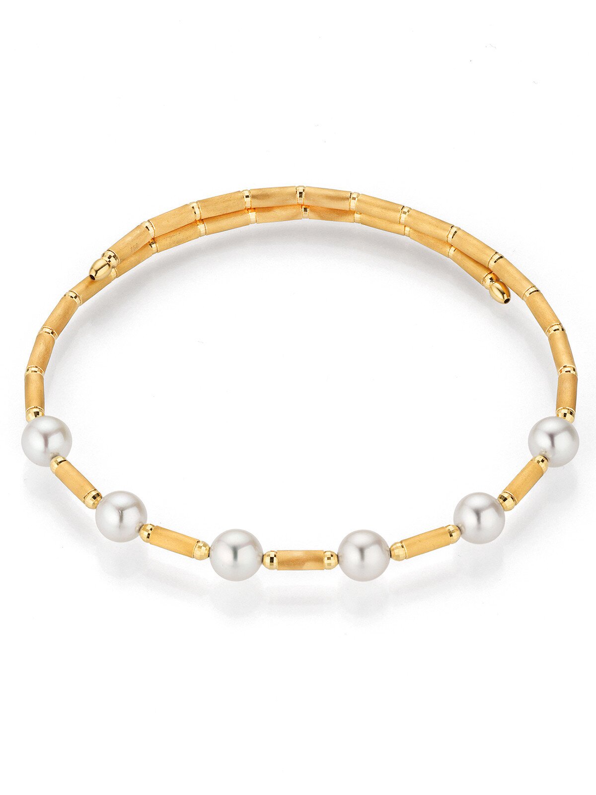Magnetic bracelet by Yana Nesper, made of K18 yellow gold with white Akoya saltwater pearls.
