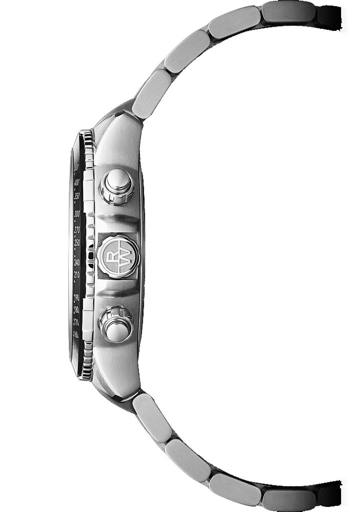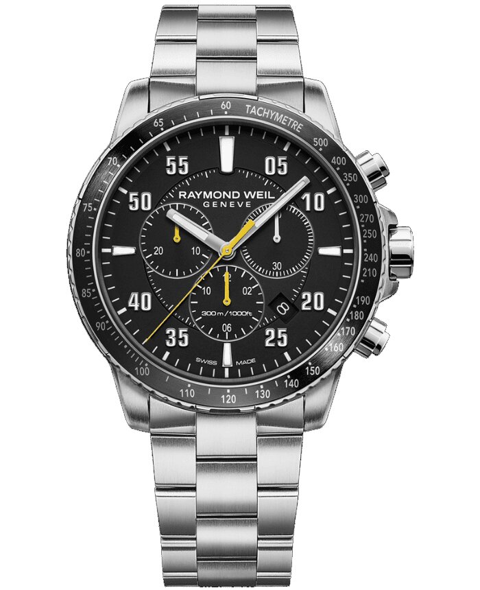 The tango quartz chronograph features a 43mm stainless steel case and an anodized black aluminum tachymeter bezel. The sleek black dial is complemented by Arabic numerals and indexes, three black subdials, a yellow second hand and date window between 4 and 5 o’clock.