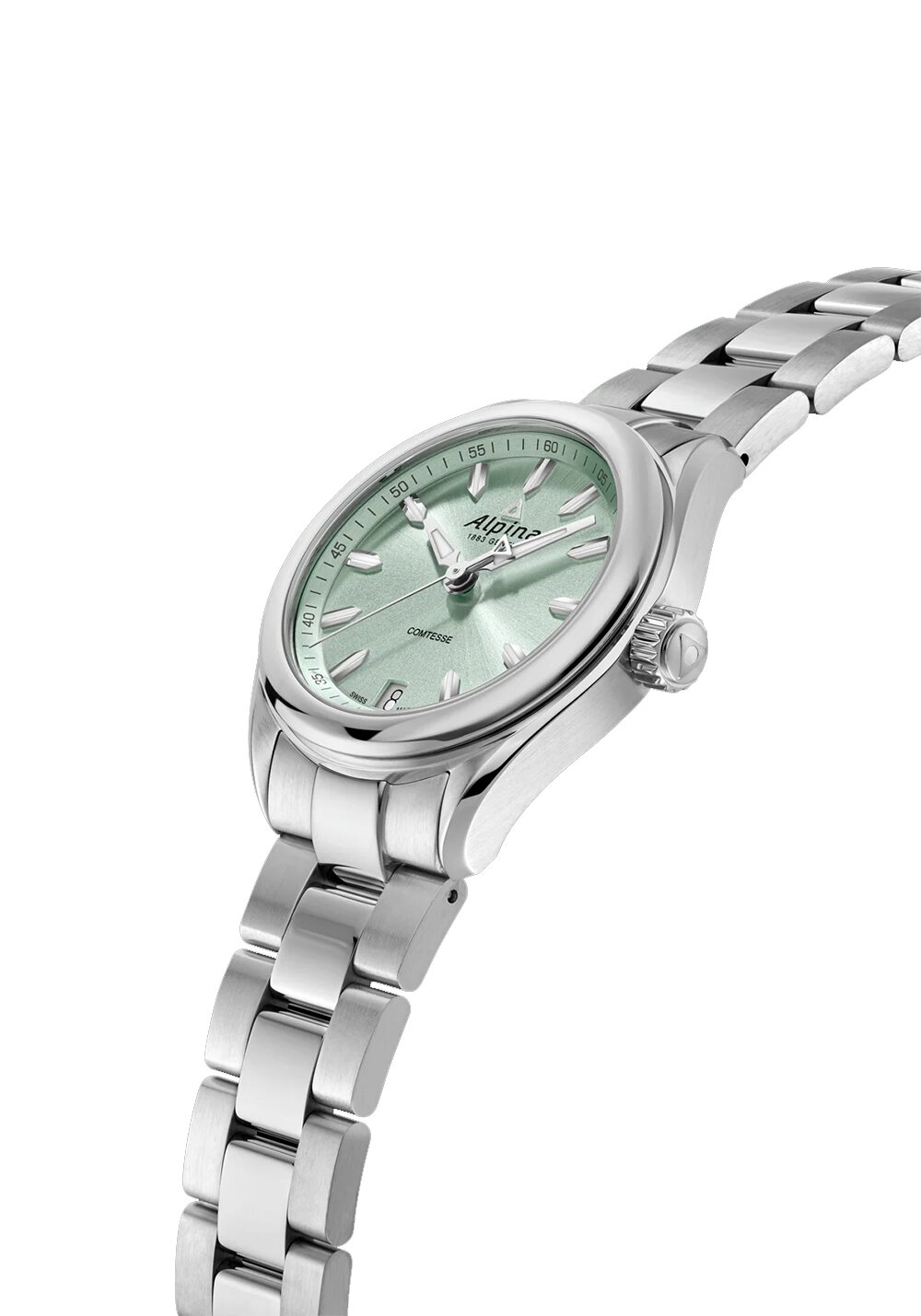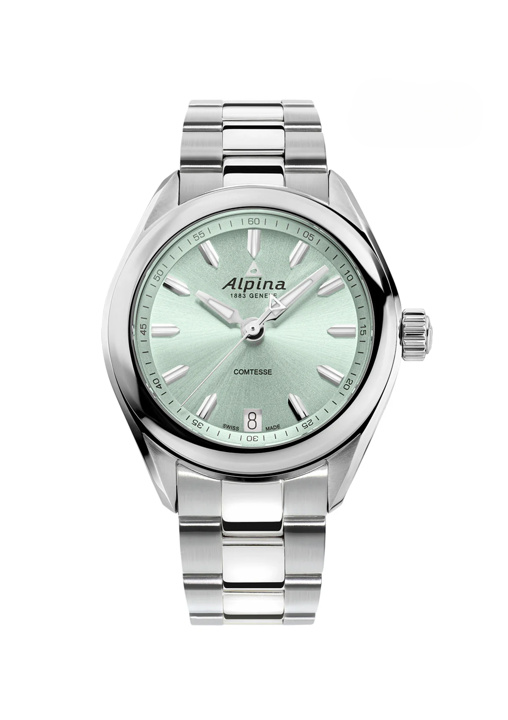 Ρολόι του οίκου Alpina, της σειράς Comtesse με  πράσινο καντράν και ατσάλινο μπρασελέ. Επίπεδο στεγανότητας στα 100 μέτρα και μέγεθος πλαισίου 34mm. Αντιχαρακτικό κρύσταλλο σαπφείρου. Ελβετικός μηχανισμός Quartz με 45 μήνες διάρκεια μπαταρίας.
