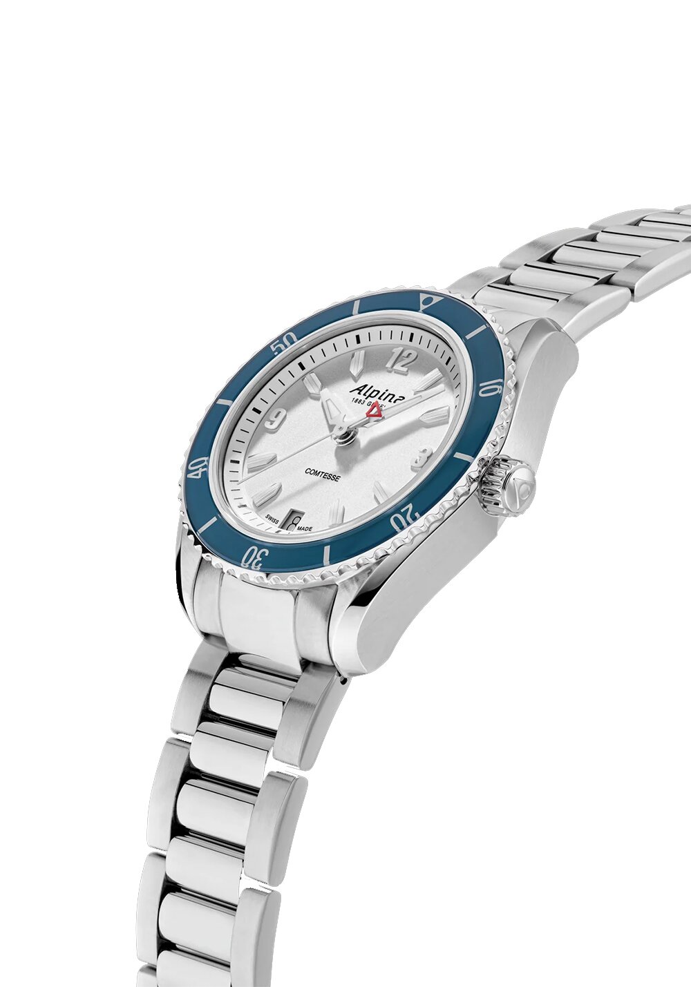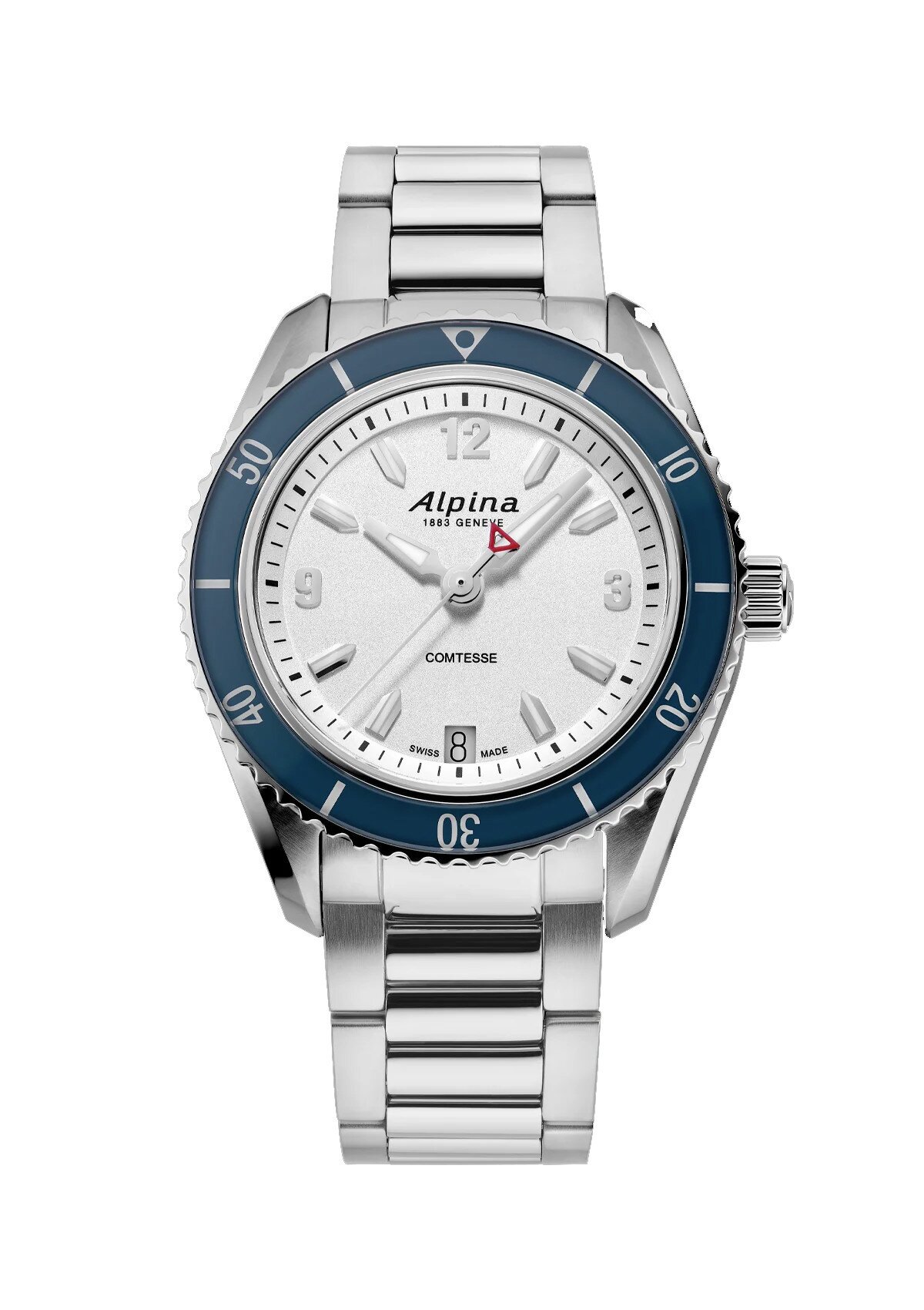 Ρολόι του οίκου Alpina, της σειράς Comtesse με  ασημί καντράν και ατσάλινο μπρασελέ. Επίπεδο στεγανότητας στα 60 μέτρα και μέγεθος πλαισίου 36.5mm. Αντιχαρακτικό κρύσταλλο σαπφείρου. Ελβετικός μηχανισμός Quartz με 45 μήνες διάρκεια μπαταρίας.