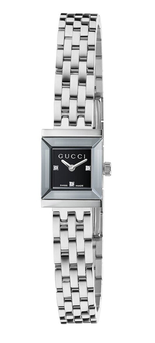 Καθορισμένη από μια κομψή κάσα σε τετράγωνο σχήμα, η συλλογή G-Frame αναμιγνύει λεπτομέρειες ιστορικών συμβόλων κληρονομιάς μαζί με μια σύγχρονη αισθητική. Η κάσα είναι κατασκευασμένη από ανοξείδωτο ατσάλι, ενώ το ρολόι αυτό εμπλουτίζεται περαιτέρω με ένα μαύρο καντράν με διαμάντια και ένα μπρασελέ επίσης από ανοξείδωτο ατσάλι.