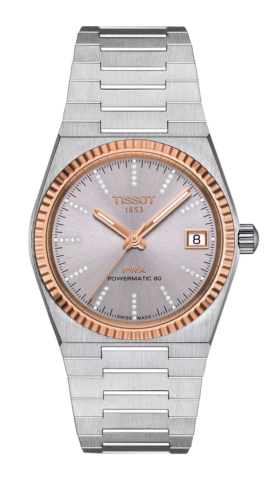 Αυτόματο ρολόι του οίκου Tissot, της σειράς T-Gold, έκδοση PRX με γκρι καντράν και ατσάλινο μπρασελέ. Επίπεδο στεγανότητας στα 100 μέτρα και μέγεθος πλαισίου 35mm.Κάσα από ανοξείδωτο ατσάλι 316L με επίστρωση στη στεφάνη ροζ χρυσού 18K. Διαθέτει παράθυρο με ένδειξη ημερομηνίας και 44 διαμάντια, 0.0704 ct, vs-si,Top Wesselton, 8/8 Single cut. Αντιχαρακτικό κρύσταλλο σαπφείρου μπρος και στην πίσω πλευρά με εμφανή το μηχανισμό του. Ελβετικός αυτόματος μηχανισμός POWERMATIC 80.121 calibre με απόθεμα ενέργειας έως 80 ώρες power-reserve. Μπρασελέ από ανοξείδωτο ατσάλι, εναλλασσόμενο μπρασελέ με σύστημα γρήγορης αλλαγής, κούμπωμα πεταλούδας με πιεζόμενα κουμπιά.