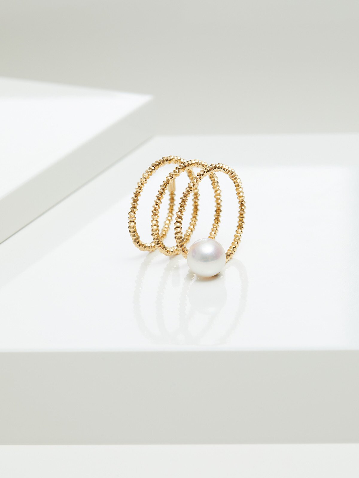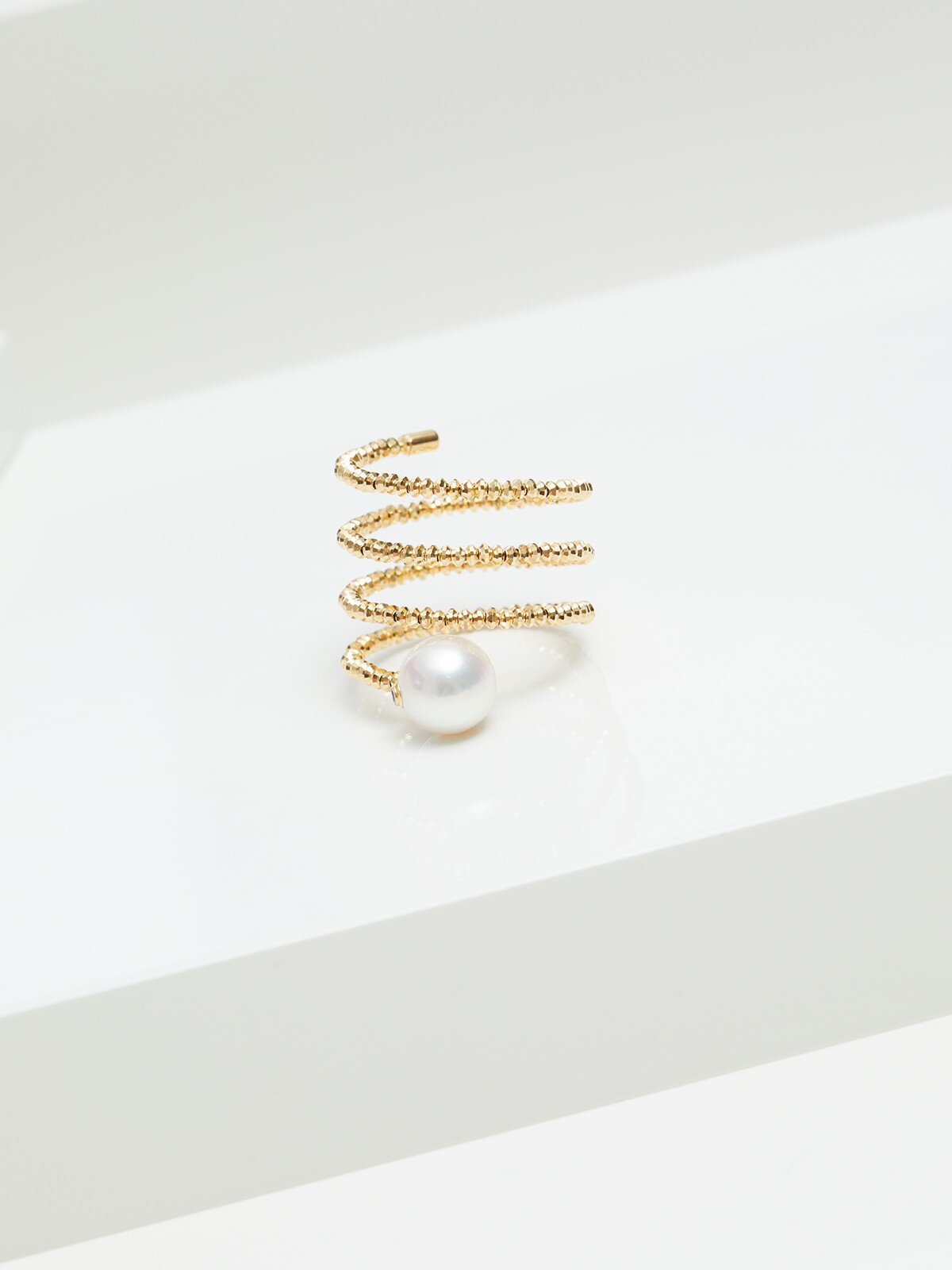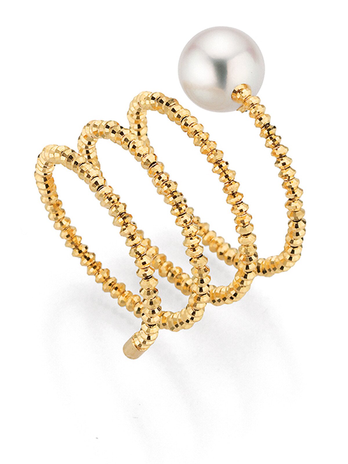 Tυλιχτό δαχτυλίδι της εταιρείας Yana Nesper, από κίτρινο χρυσό Κ18 με λευκό μαργαριτάρι αλμυρού νερού κατηγορίας Akoya. Εξυπηρετεί κάθε μεγεθολόγιο, χάρη στο "σύστημα μνήμης" που διαθέτει.