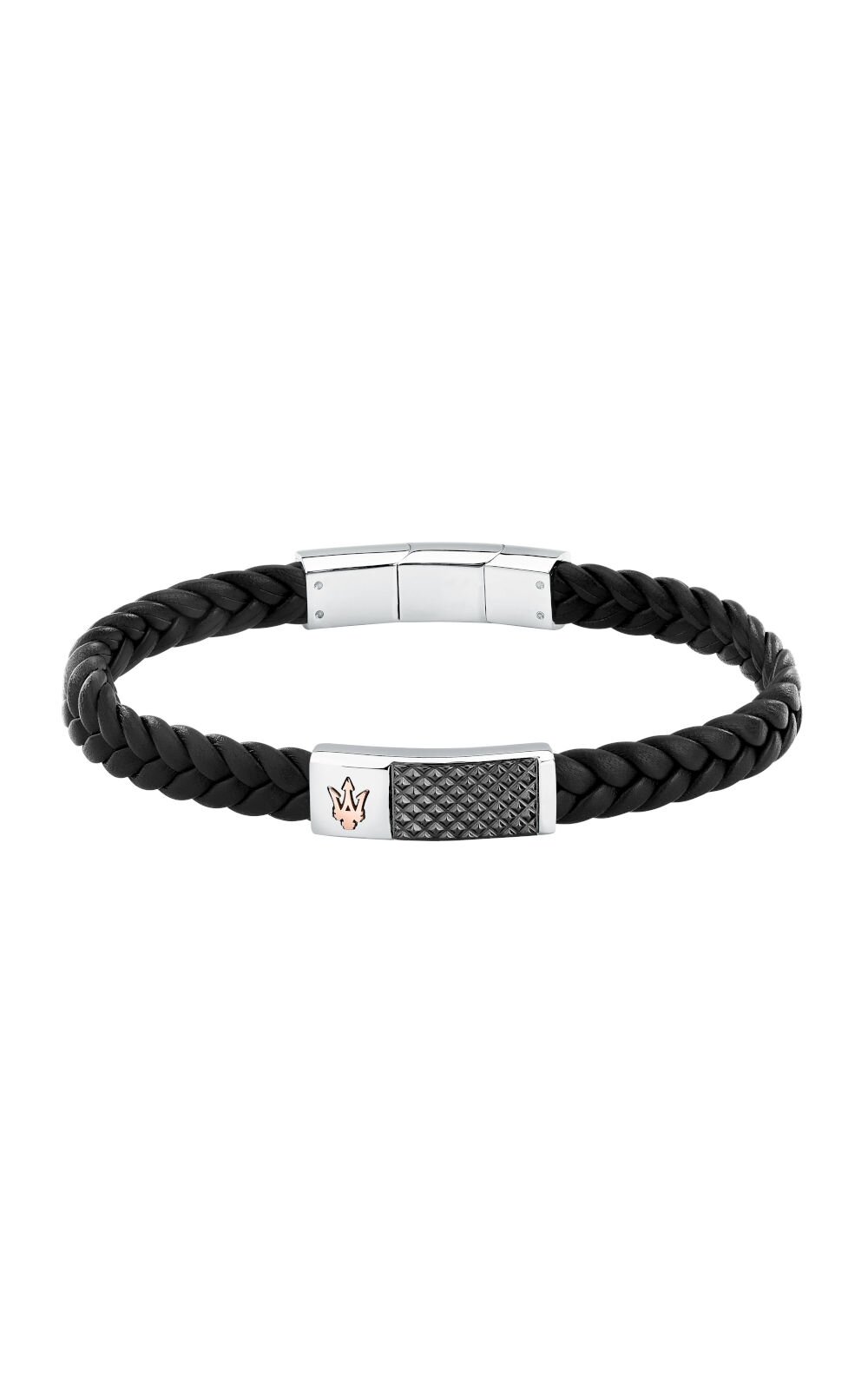 Ανδρικό βραχιόλι MASERATI με μαύρο δερμάτινο λουράκι. To βραχιόλι έχει ασημένιες και μαύρες λεπτομέρειες από ανοξείδωτο ατσάλι και το λογότυπο της εταιρείας (19+1cm). Συνοδεύεται από Πιστοποιητικό Αυθεντικότητας Maserati σε επίσημη συσκευασία Maserati.