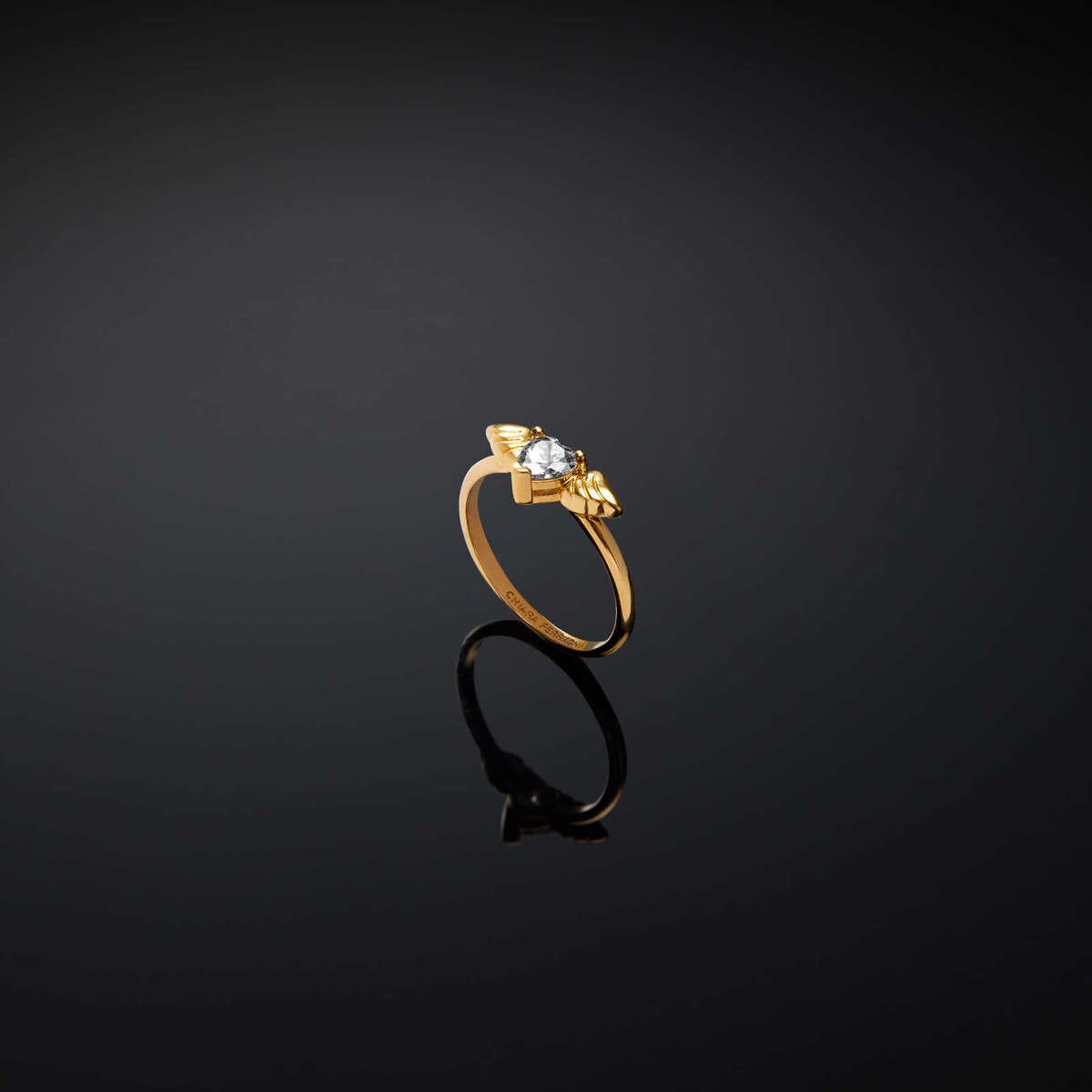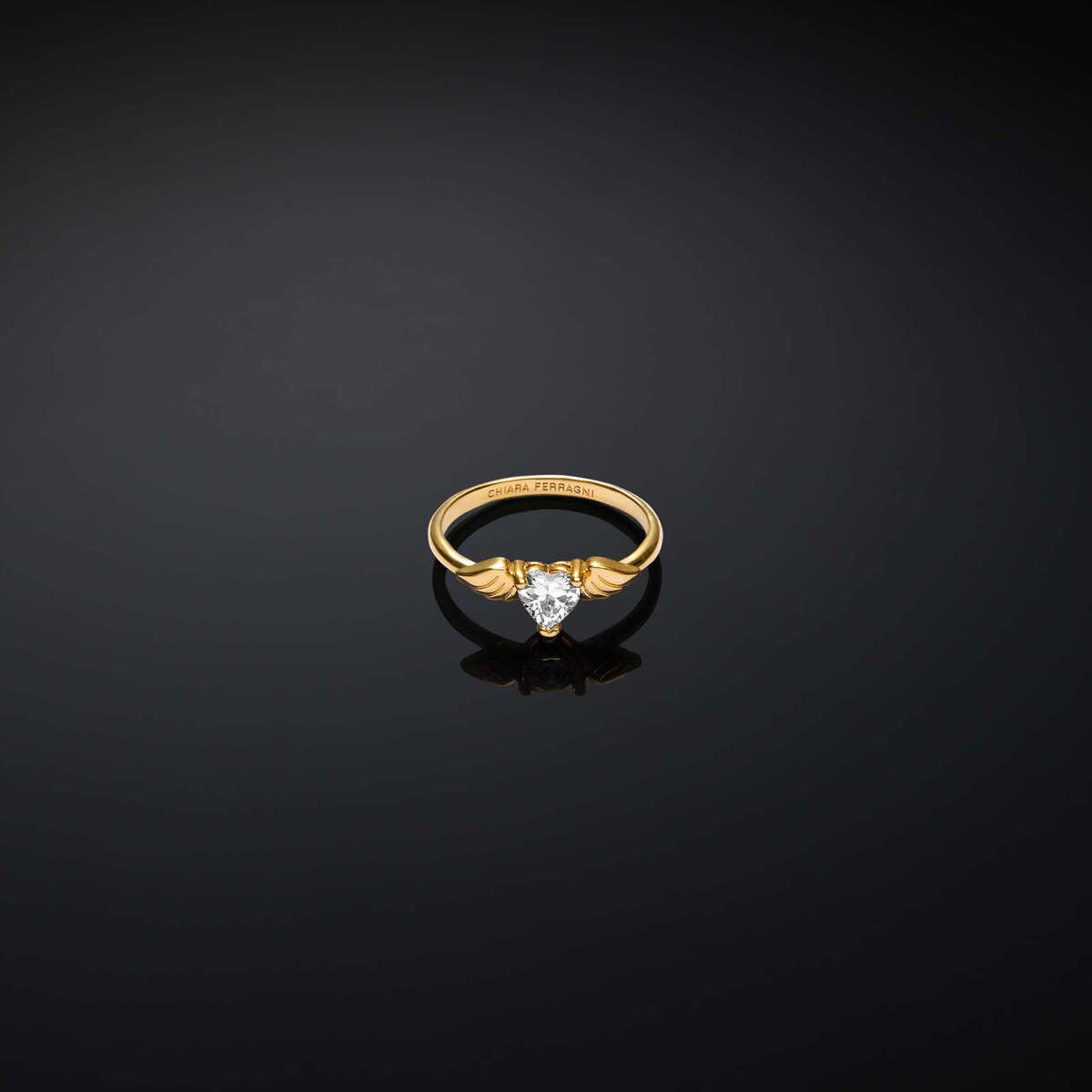 Γυναικείο δαχτυλίδι CHIARA FERRAGNI No.12, χρυσού χρώματος με σχέδιο καρδιά με φτερά. Είναι κατασκευασμένο από κράμα μετάλλων και είναι διακοσμημένο με διάφανη πέτρα.