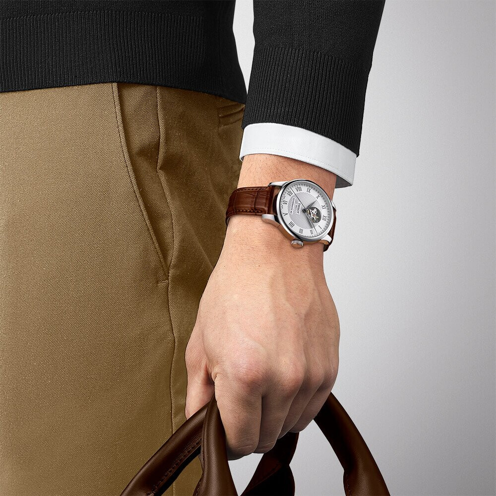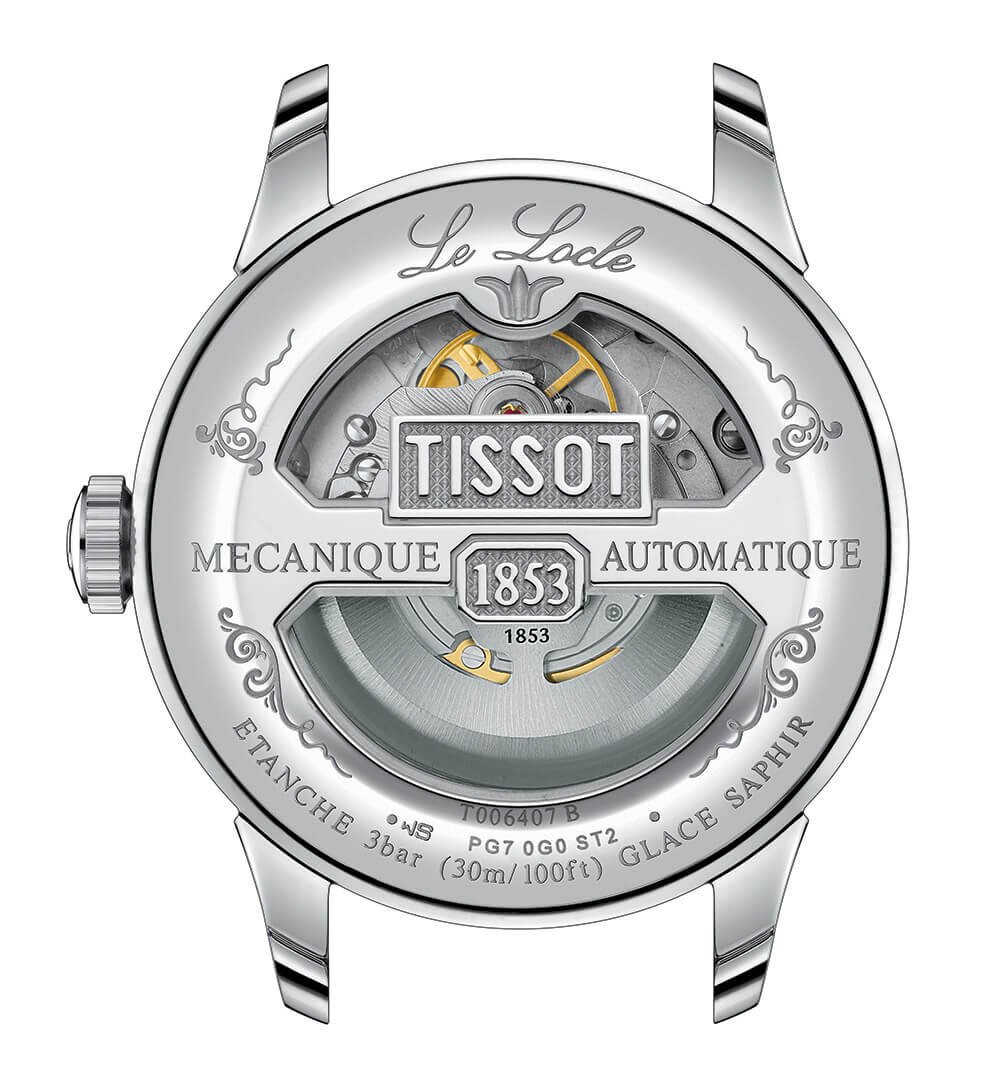 Αυτόματο ρολόι του οίκου Tissot, της σειράς T-Classic, Le Locle με ασημί καντράν και καφέ δερμάτινο λουράκι. Επίπεδο στεγανότητας στα 30 μέτρα και μέγεθος πλαισίου 39.3mm Open Heart. Αντιχαρακτικό κρύσταλλο σαπφείρου μπρος και στην πίσω πλευρά με εμφανή το μηχανισμό του. Ελβετικός αυτόματος μηχανισμός POWERMATIC 80.601 με απόθεμα ενέργειας έως 80 ώρες power-reserve. Το λουράκι είναι καφέ συνθετικό δέρμα ανάγλυφο τύπου αλιγάτορα.