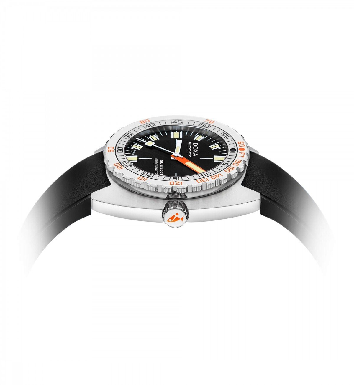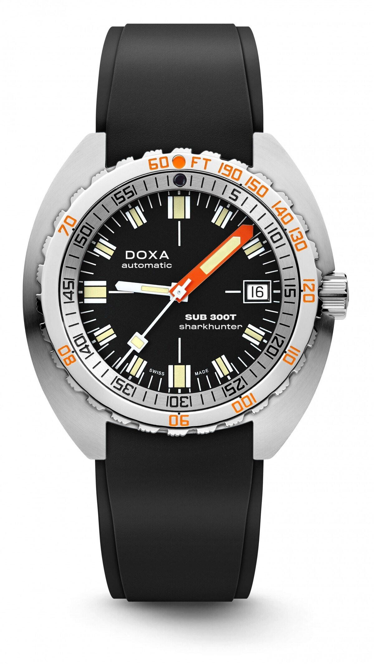 Αυτόματο ρολόι του ελβετικού οίκου DOXA της σειράς SUB 300T, Sharkhunter με μαύρο  καντράν και μαύρο λουράκι καουτσούκ. Επίπεδο στεγανότητας 1200m και μέγεθος πλαισίου 42.5mm. To 1969 η DOXA λάνσαρε το SUB 300T Conquistador, το πρώτο καταδυτικό ρολόι με βαλβίδα ηλίου, προσβάσιμο στο ευρύ κοινό. 50 χρόνια αργότερα, το νέο SUB 300T που παρουσιάστηκε το Σεπτέμβριο του 2019 αποτελεί φόρο τιμής στο αρχικό επαναστατικό μοντέλο. Αυτό το 3-hand καταδυρικό ρολόι συνδυάζει την αισθητική του αρχικού SUB 300T Conquistador με όλες τις τεχνικές βελτιστοποιήσεις που έχει ένα καταδυτικό ρολόι του σήμερα. Κατασκευασμένο από ανοξείδωτο ατσάλι υψηλής ποιότητας 316L, το SUB 300T έχει διάμετρο 42.5mm και αντιχαρακτικό κρύσταλλο σαπφείρου με αντιανακλαστική επίστρωση. Έχει αξιολογηθεί να αντέχει πίεση ως τα 120 bar, αυτό το καταδυτικό ρολόι είναι αδιάβροχο μέχρι βάθος 1200 μέτρα και διαθέτει τη χαρακτηριστική πατέντα της DOXA, τη στεφάνη μονής περιστροφής με ενσωματωμένο μηχανισμό υπολογισμού χρόνου κατάδυσης. Όλα τα στοιχεία έχουν επένδυση από φωσφορίζον υλικό Super‑LumiNova® για καλύτερη αναγνωσιμότητα υποβρυχίως. Αυτόματος μηχανισμός με απόθεμα 38 ώρες power-reserve, Frequency 28,800 vph (4.0 Hz) & 26 Jewels. Το λουράκι είναι από μαύρο καουτσούκ με αναδιπλούμενο κούμπωμα πάνω στο οποίο υπάρχει το χαρακτηριστικό σύμβολο ψάρι της DOXA (ειδική επέκταση για καταδύσεις). Συνοδεύεται από 2 χρόνια  εγγύηση αντιπροσωπείας DOXA με όλα τα εγχειρίδια χρήσης στην επίσημη συσκευασία DOXA.