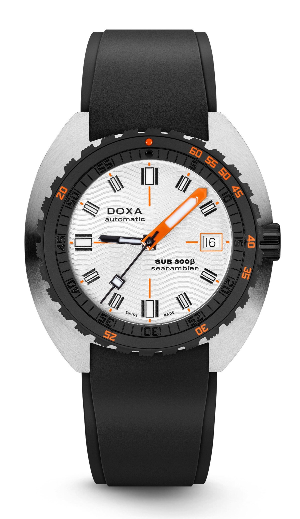 Αυτόματο ρολόι του ελβετικού οίκου DOXA της σειράς SUB 300β έκδοση Searambler, με ασημί καντράν και μαύρο καουτσούκ λουράκι. Επίπεδο στεγανότητας 300m και διάμετρο 42.5mm, από ανοξείδωτο ατσάλι υψηλής ποιότητας και κεραμική στεφάνη. Θολωτό αντιχαρακτικό κρύσταλλο σαπφείρου και στεφάνη περιστροφής. Όλα τα στοιχεία προσφέρουν πληροφορίες σχετικές με την κατάδυση κι έχουν φωσφορίζον υλικό Super‑LumiNova®. Ο μηχανισμός είναι ελβετικός αυτόματος με απόθεμα 38 ώρες power-reserve, Frequency 28,800 vph.