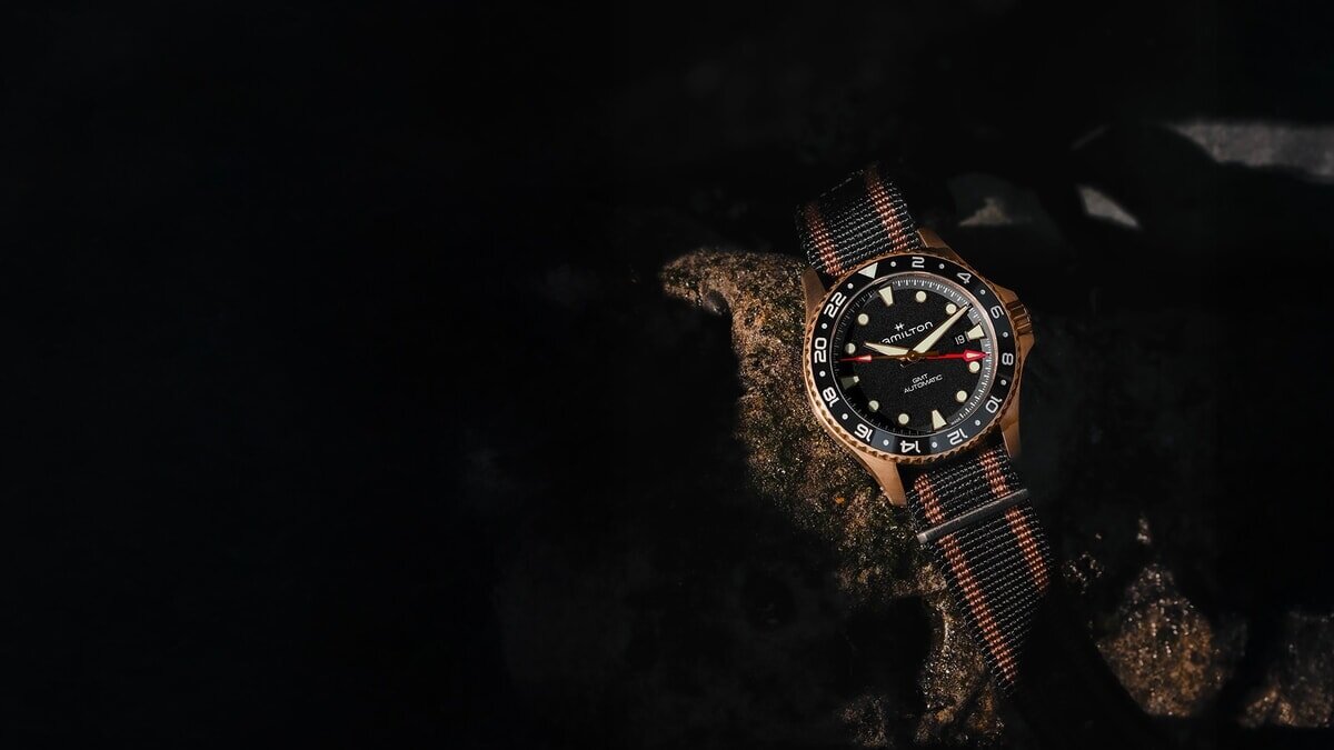 Αυτόματο ρολόι του οίκου Hamilton της σειράς Khaki Navy Scuba με υφασμάτινο λουράκι και μαύρο καντράν. Η κάσα του ωρολογίου είναι από χαλκό και τιτάνιο. Ο κόκκινος δείκτης υποδεικνύει τη λειτουργία GMT και διευκολύνει στην ανάγνωση της δεύτερης ζώνης ώρας. Επίπεδο στεγανότητας 300m και μέγεθος πλαισίου 43mm. Διαθέτει βιδωτή κορώνα. Αυτόματος μηχανισμός Η-14 με αυτονομία έως και 80 ώρες.