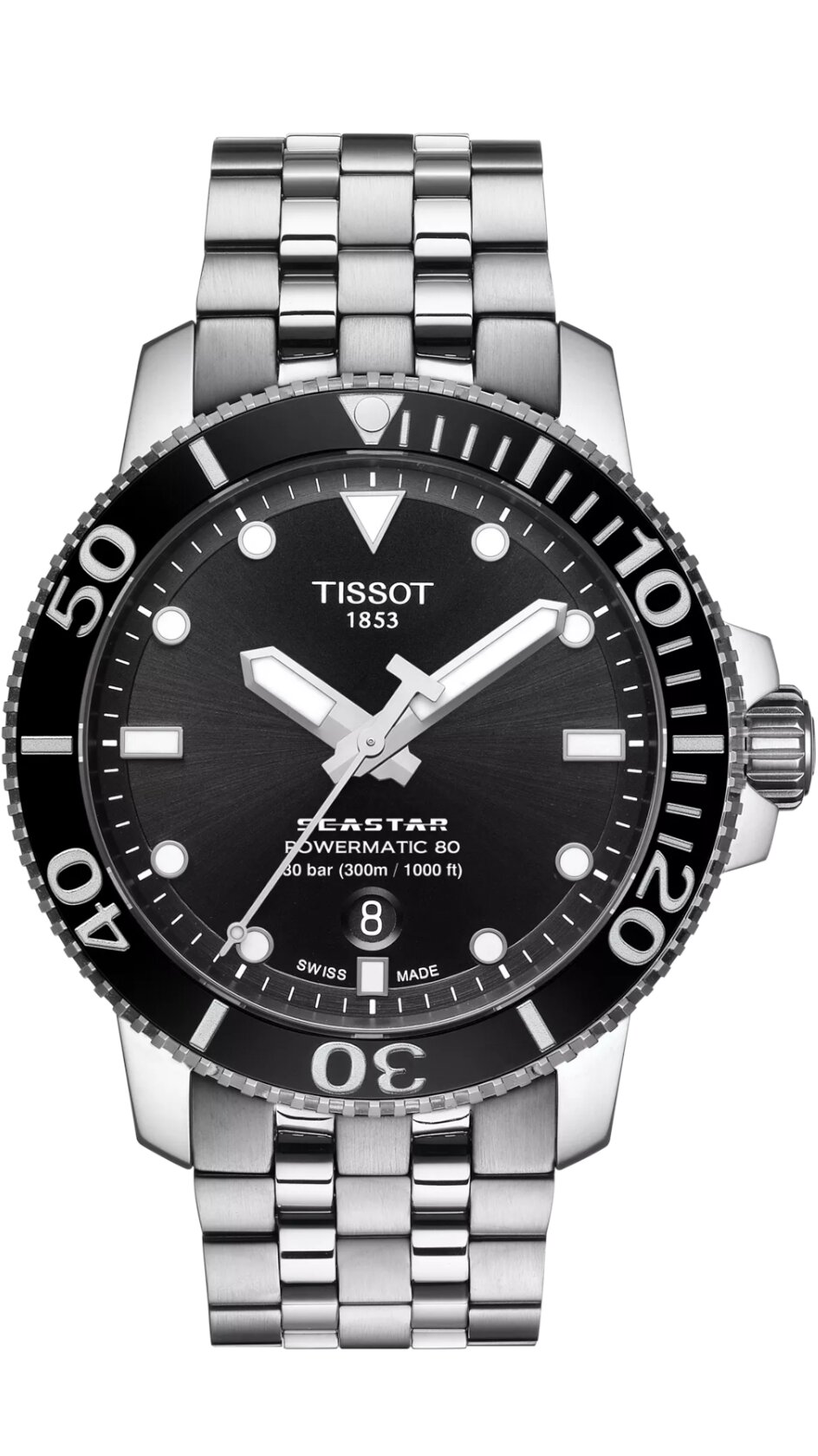 Ρολόι του οίκου Tissot, της σειράς T-Sport Seastar  με ελβετικό αυτόματο μηχανισμό powermatic 80 με 80 ώρες power reserve, ατσάλινο μπρασελέ και μαύρο καντράν. Επίπεδο στεγανότητας στα 300 μέτρα και μέγεθος πλαισίου 43mm. Διαθέτει παράθυρο με ένδειξη ημερομηνίας. Αντιχαρακτικό κρύσταλλο σαπφείρου.