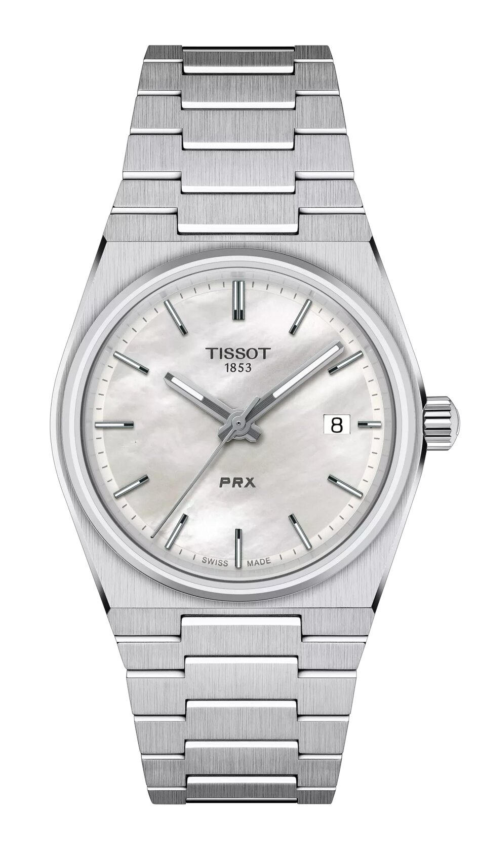 Ρολόι του οίκου Tissot, της σειράς PRX με White mother-of-pearl καντράν και ατσάλινο μπρασελέ. Κάσα από ανοξοόδωτο ατσάλι. Επίπεδο στεγανότητας στα 100 μέτρα και μέγεθος πλαισίου 35mm από ανοξείδωτο ατσάλι 316L. Διαθέτει παράθυρο με ένδειξη ημερομηνίας. Αντιχαρακτικό κρύσταλλο σαπφείρου με αντιανακλαστική επίστρωση. Ελβετικός μηχανισμός μπαταρίας. Δείκτες με υλικό  Superluminova.