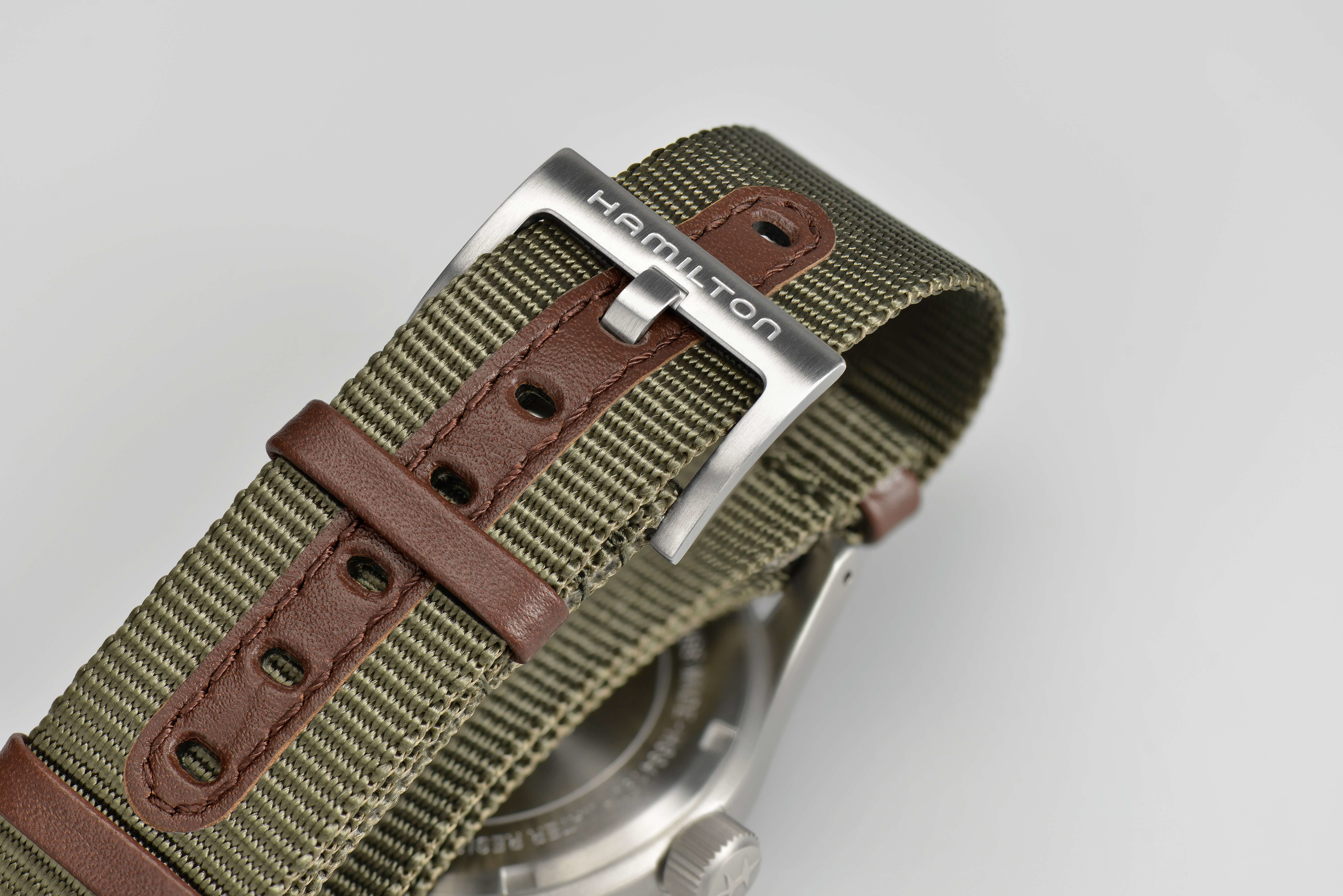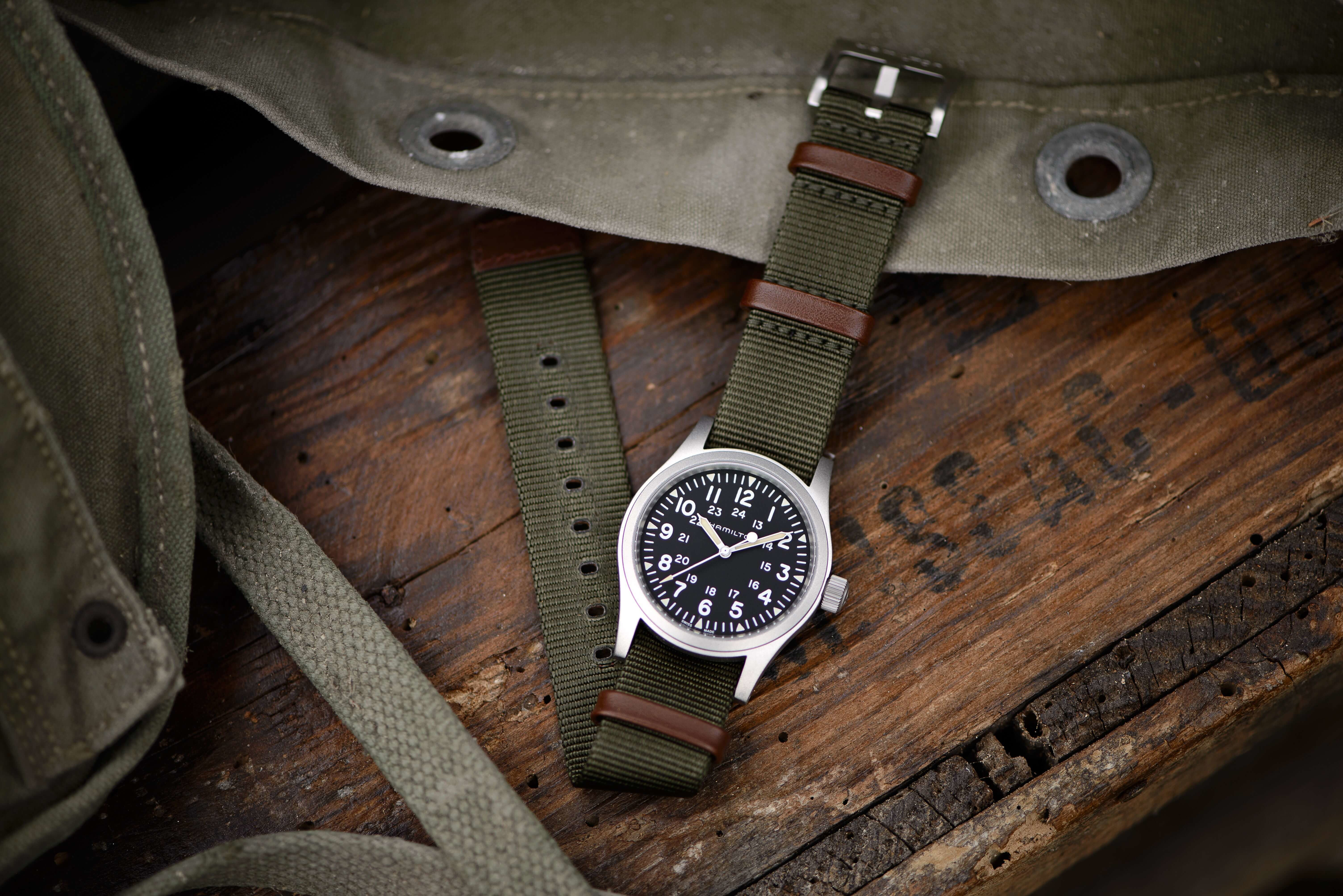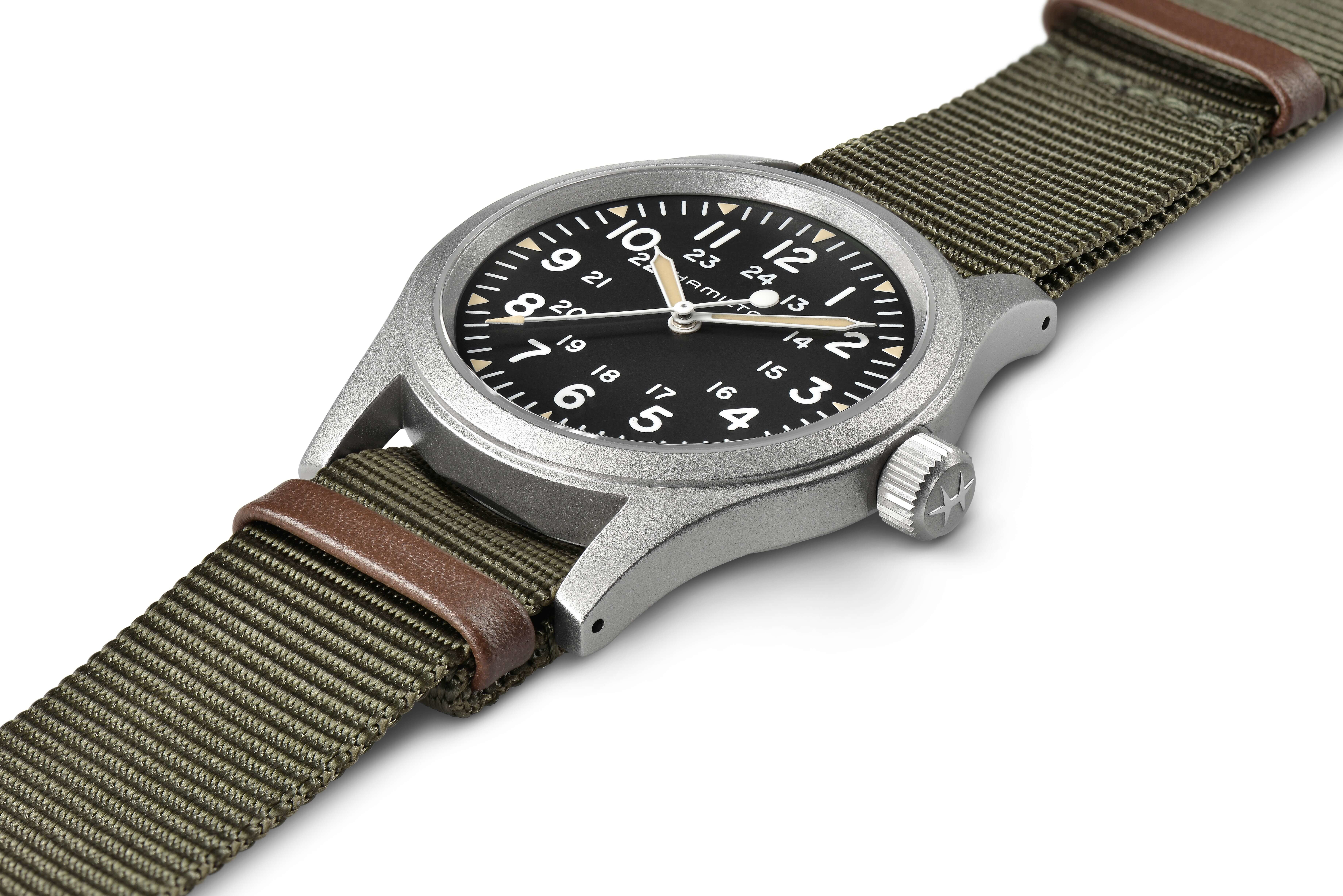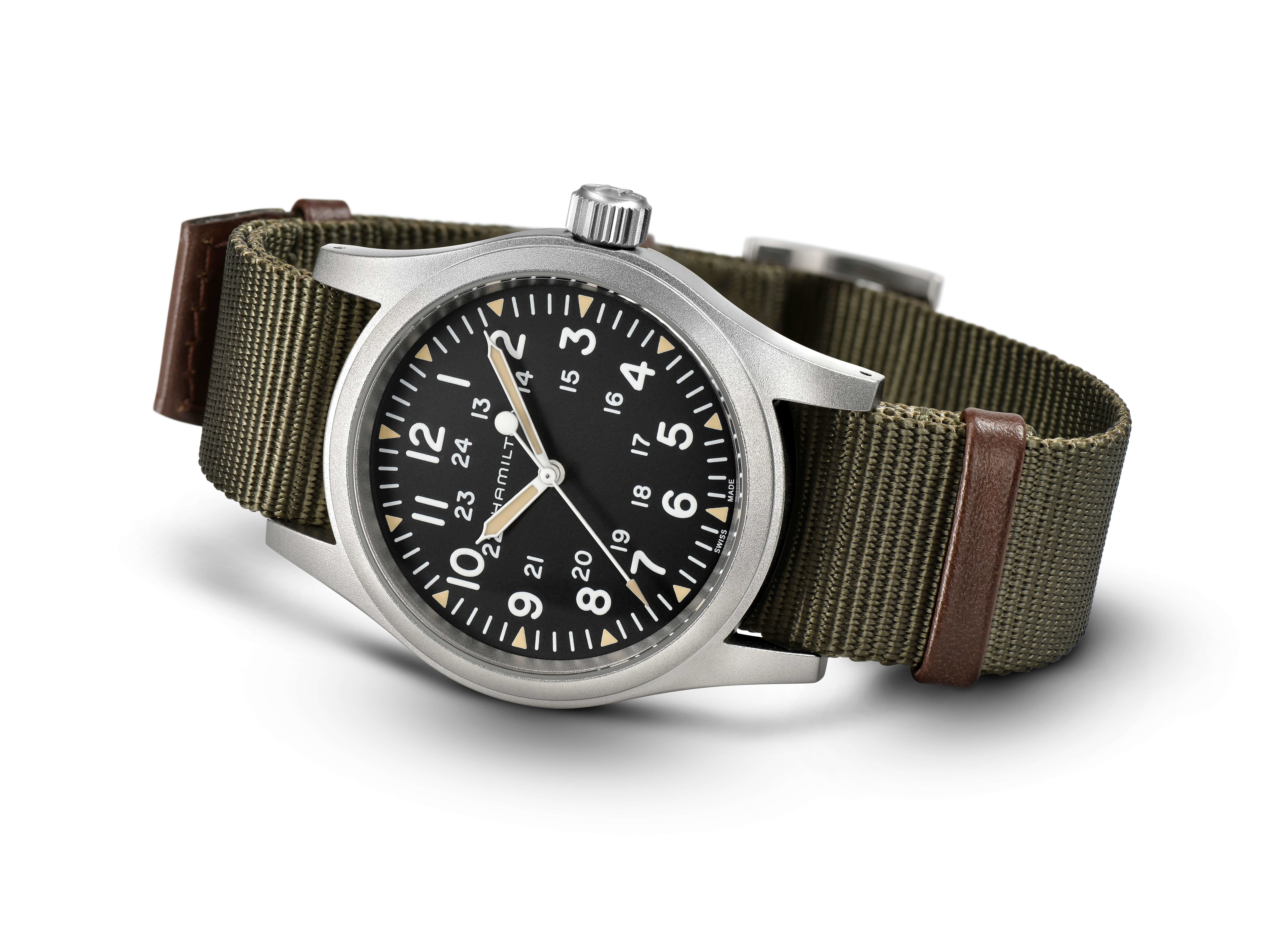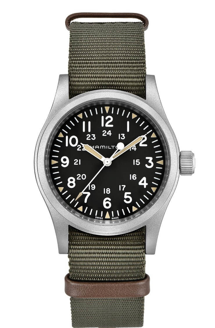 Κουρδιστό ρολόι του οίκου Hamilton της σειράς Khaki Field με χακί ΝΑΤΟ λουράκι και μαύρο καντράν. Eπίπεδο στεγανότητας 50m και μέγεθος πλαισίου 38mm. Κουρδιστός μηχανισμός με αυτονομία 80 ώρες power reserve.
