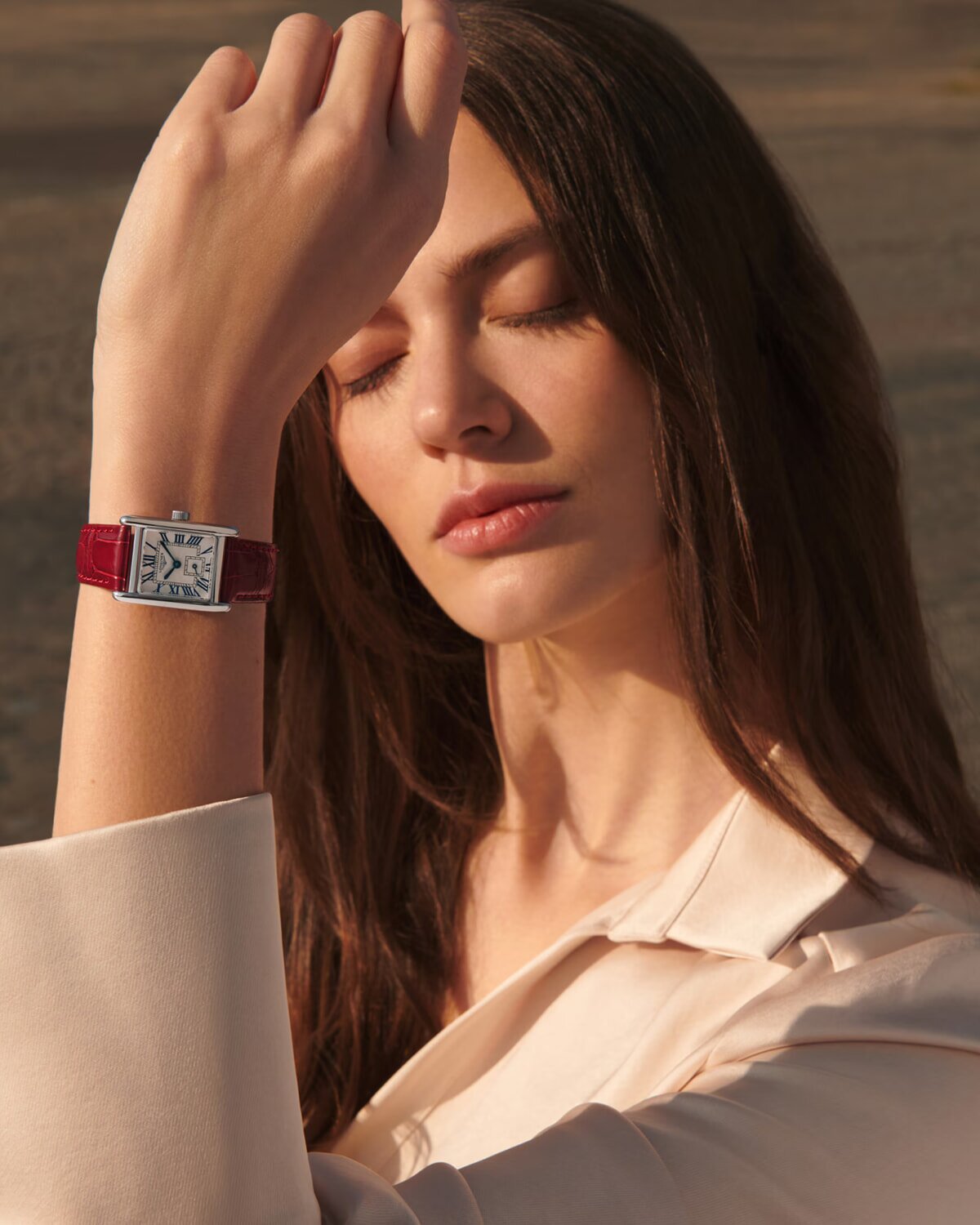 Ρολόι του οίκου Longines της σειράς DOLCE VITA με παραλληλόγραμμο ατσάλινο πλαίσιο, ασημί καντράν και κόκκινο δερμάτινο λουράκι. Μηχανισμός μπαταρίας ελβετικός και επίπεδο στεγανώτητας στα 30 μέτρα. Κάσωμα από ανοξοίδωτο ατσάλι και αντιχαρακτικό κρύσταλλο σαπφείρου.