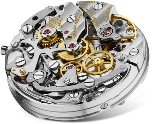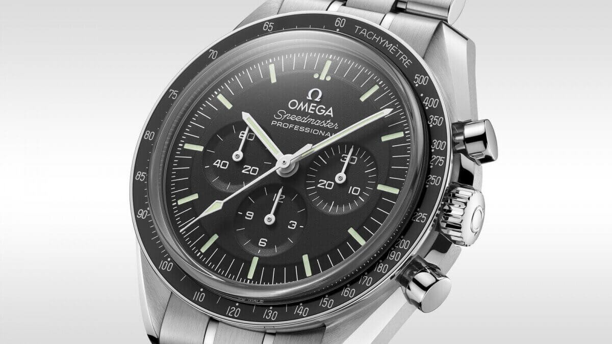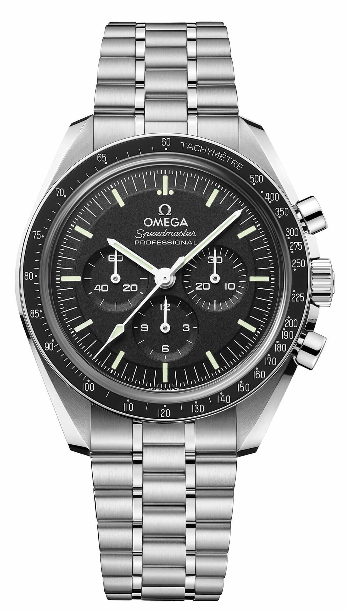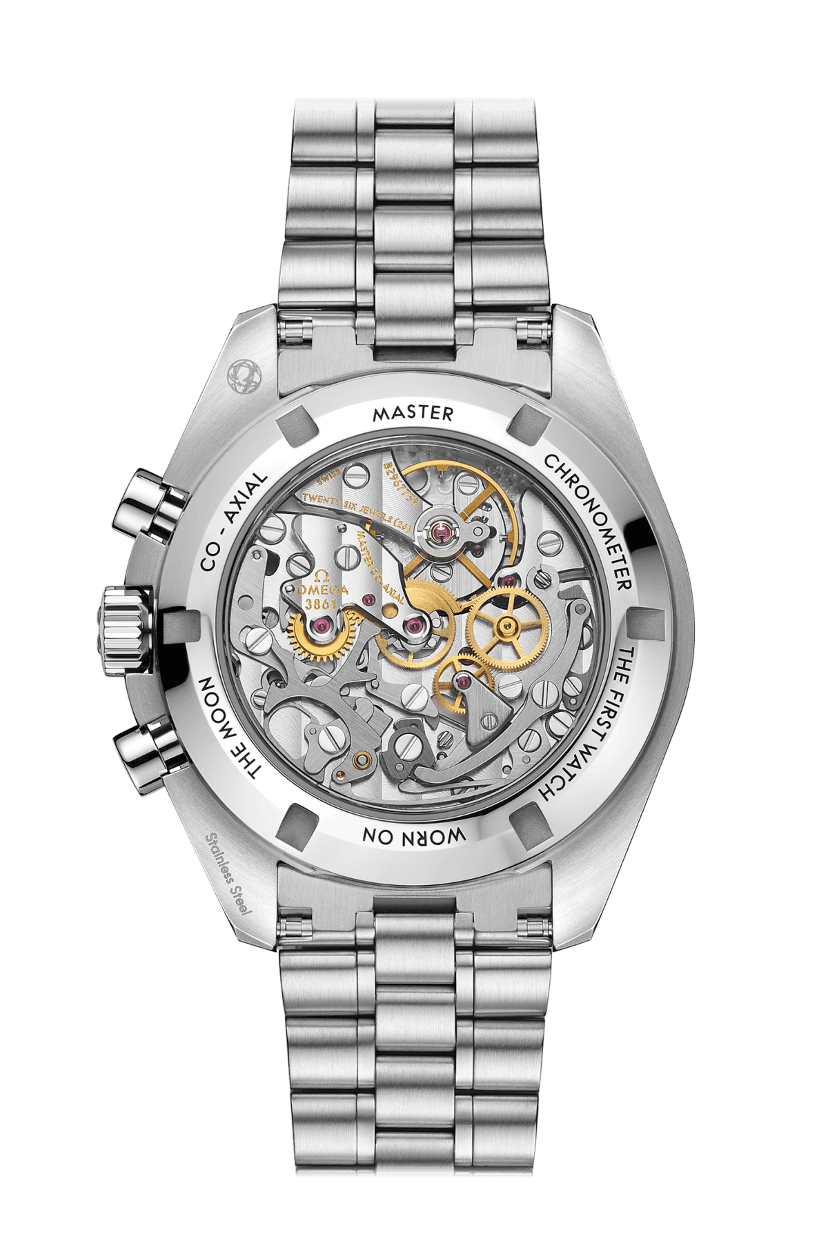 Moonwatch • Χρονογράφος Omega, της σειράς Speedmaster,  με ατσάλινο μπρασελέ και μαύρο καντράν. Επίπεδο στεγανότητας στα 50 μέτρα και μέγεθος πλαισίου 42mm. Διαθέτει στεφάνη αλουμινίου με ταχύμετρο. Επιπλέον μικρό καντράν ένδειξης δευτερολέπτων στο καντράν του. Ανοιχτή πλάτη με εμφανή το μηχανισμό του. Κρύσταλλο Sapphire προστατεύει το καντράν και τον μηχανισμό στην πίσω πλευρά. Λειτουργίες χρονογράφου: 30-minute recorder and 12-hour recorder. Μηχανισμός κουρδιστός Omega Co-Axial Master Chronometer calibre 3861 με 50 ώρες power reserve. Συνοδεύεται από 5 χρόνια Εγγύηση επίσημης αντιπροσωπείας Omega μέσα στο ειδικό κουτί συσκευασίας του.