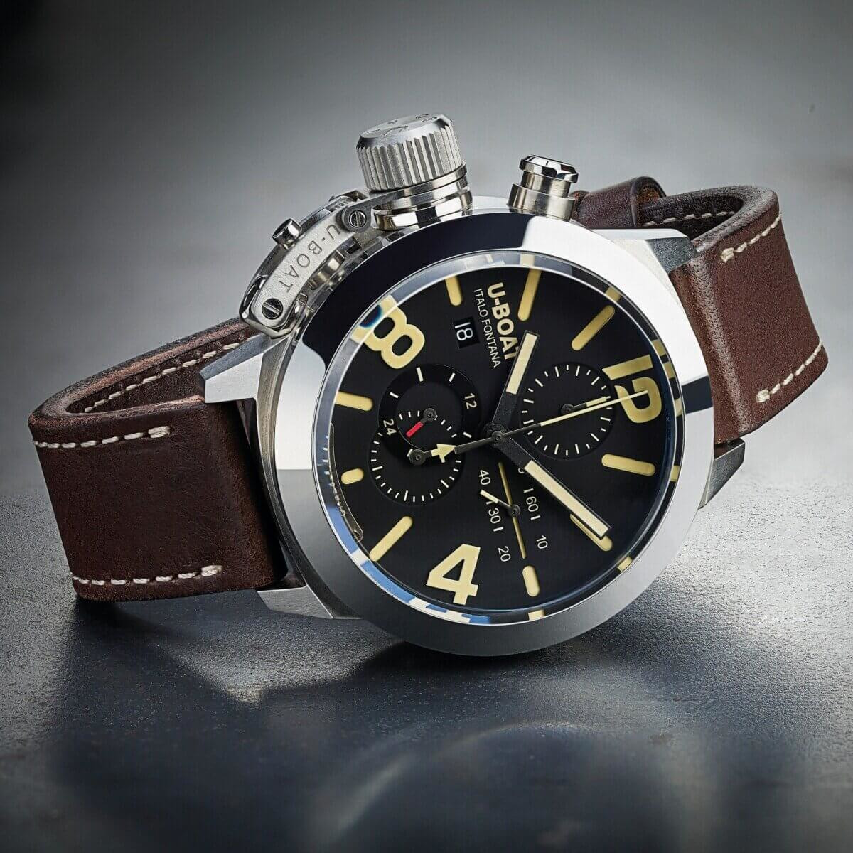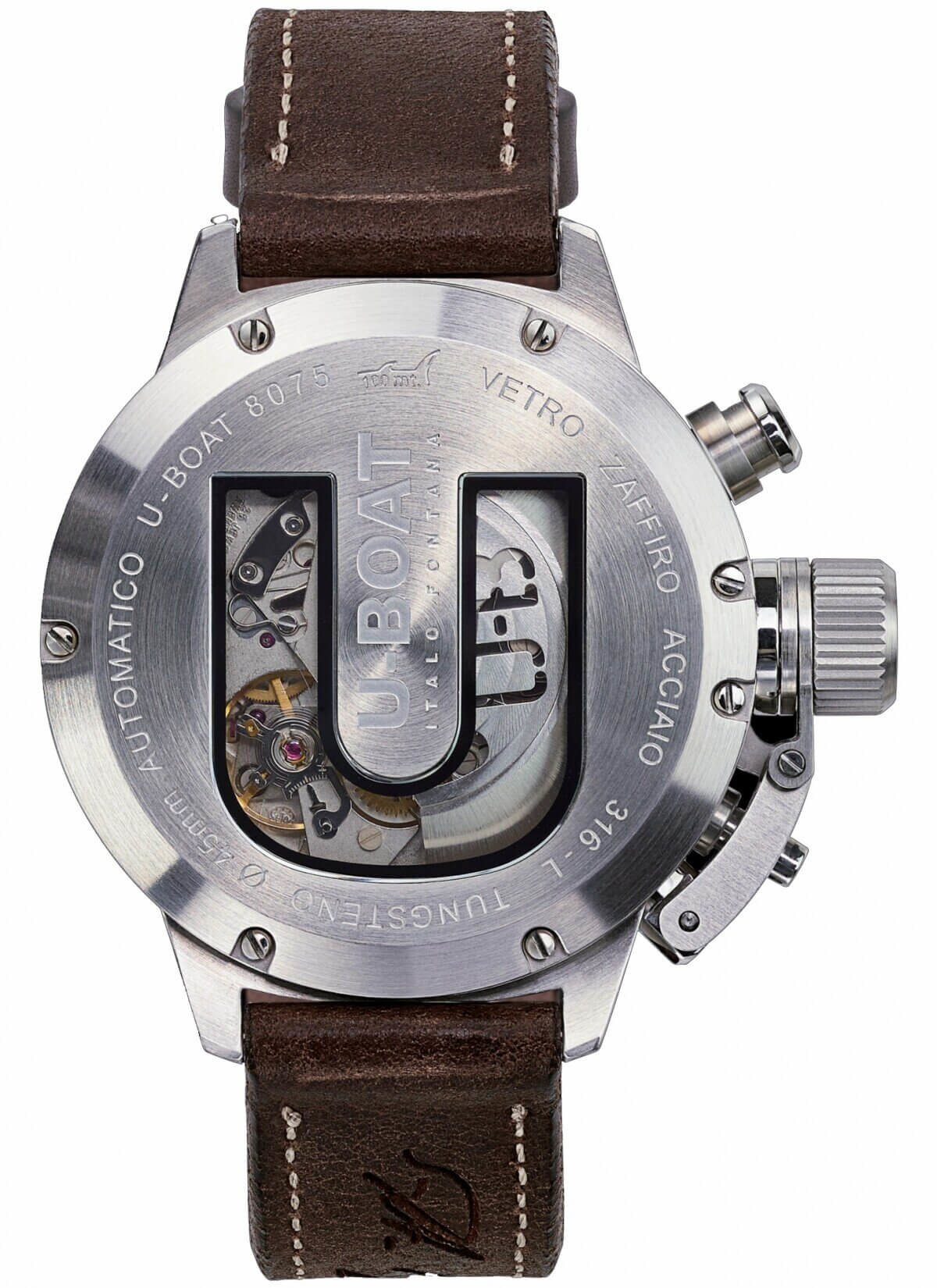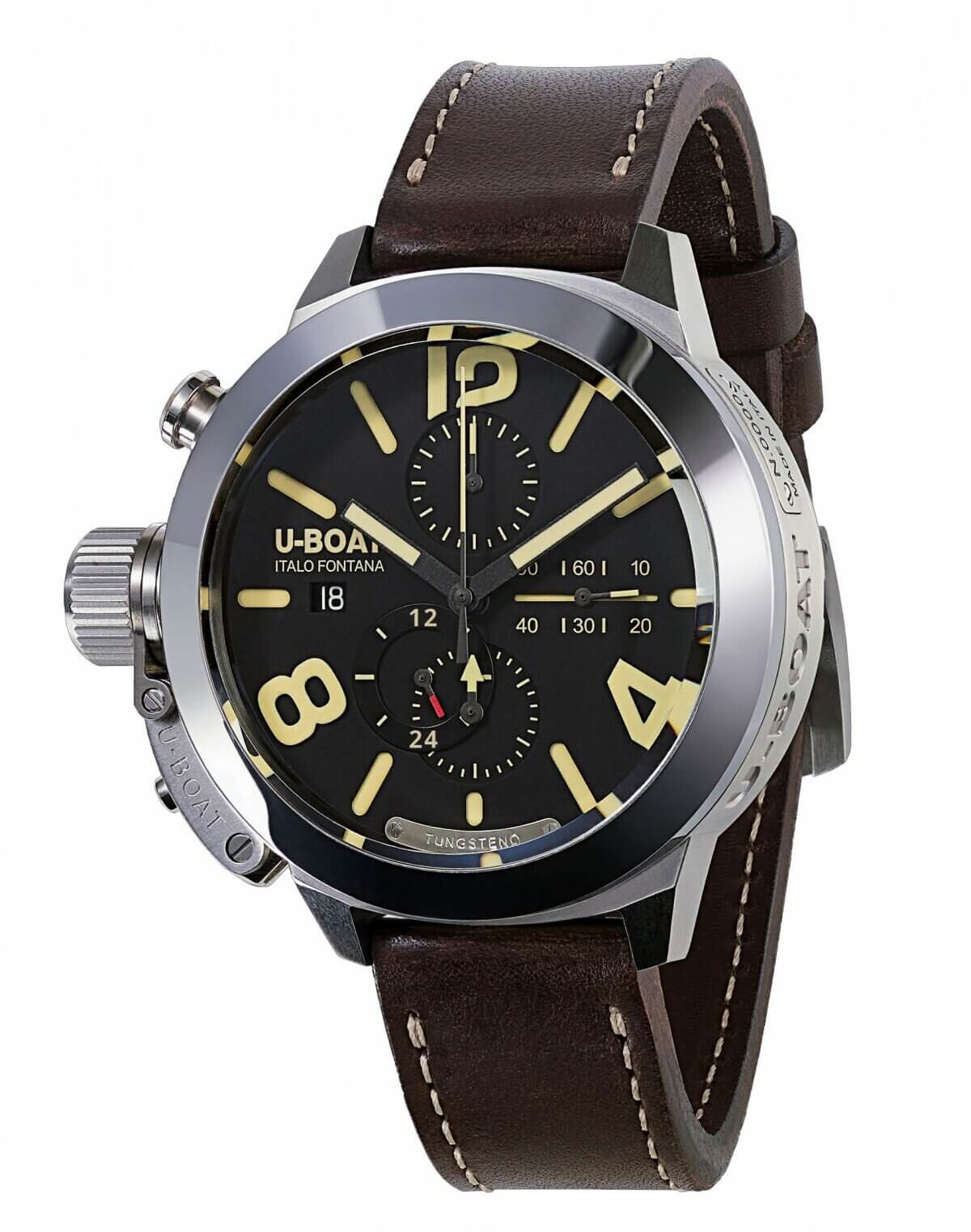 Αυτόματος χρονογράφος U-Boat, της σειράς Classico, Tungsten με μαύρο ματ καντράν και καφέ δερμάτινο λουράκι. Διαθέτει παράθυρο με ένδειξη ημερομηνίας και πατενταρισμένο σύστημα απελευθέρωσης κορώνας. Στο Classico Chrono Tungsten, όλα τα μέρη από ατσάλι έχουν σατέν χειροποίητο φινίρισμα, ενώ η στεφάνη βολφραμίου έχει γυαλιστερή στίλβωση που μοιάζει με καθρέφτη. Το βολφράμιο είναι ένα εξαιρετικά σκληρό υλικό και είναι ανθεκτικό στην τριβή σε πολύ μεγαλύτερο βαθμό από ότι το ατσάλι. Λειτουργίες: Ώρες, λεπτά, δευτερόλεπτα, ημερομηνία, χρονογράφος, ένδειξη 24 ωρών, μοχλός απελευθέρωσης κορώνας. Επίπεδο στεγανότητας στα 100 μέτρα και μέγεθος πλαισίου 45mm. Ο μηχανισμός του είναι ελβετικός αυτόματος με αυτονομία έως και 48 ώρες power reserve, εμφανής στην πίσω πλευρά του μέσα από το γράμμα U. Συνοδεύεται από 2 χρόνια Εγγύηση επίσημης αντιπροσωπείας U-BOAT στο ειδικό κουτί συσκευασίας του.