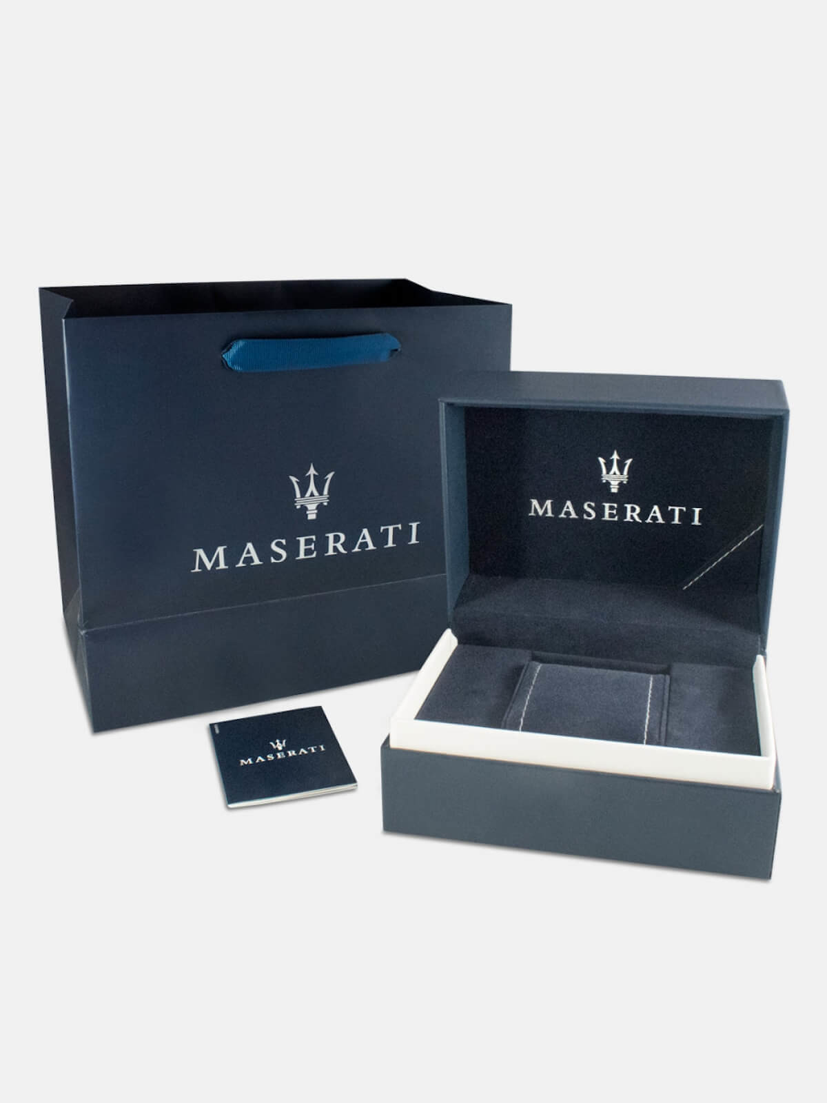 Η Maserati ιδρύθηκε από τέσσερα αδέλφια στη Μόντενα της Ιταλίας το 1914. Η Maserati είναι παγκοσμίως γνωστή για τα γρήγορα σπορ αυτοκίνητα που κατασκευάζονται στην Ιταλία. Επιπλέον, η εταιρεία επεκτείνει στο χώρο των αξεσουάρ για χρόνια, έτσι ώστε οι οπαδοί της μάρκας να μπορούν να απολαύσουν τον τρόπο ζωής της Maserati. Τα ρολόγια Maserati κατασκευάζονται από άριστα υλικά και χαρακτηρίζονται από κλασική ιταλική κομψότητα. Το λογότυπό τους έχει σχήμα τρίαινα του Ποσειδώνα, εμπνέοντας το όραμα της πολυτέλειας, της κομψότητας και ττης αχύτητας.